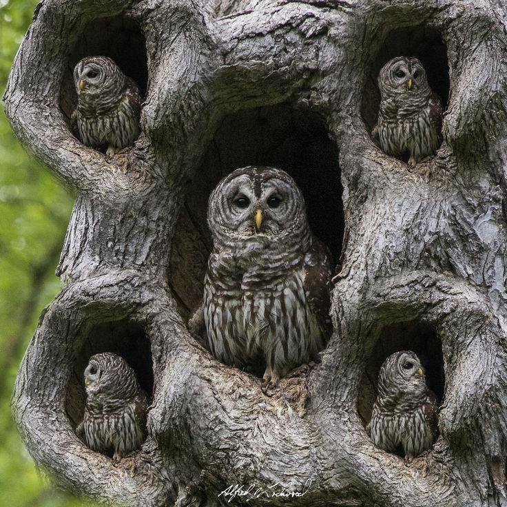 “Who?” “Who?” “Who?” “Who?” “Who?” said the five owls from the five hollows in the tree.